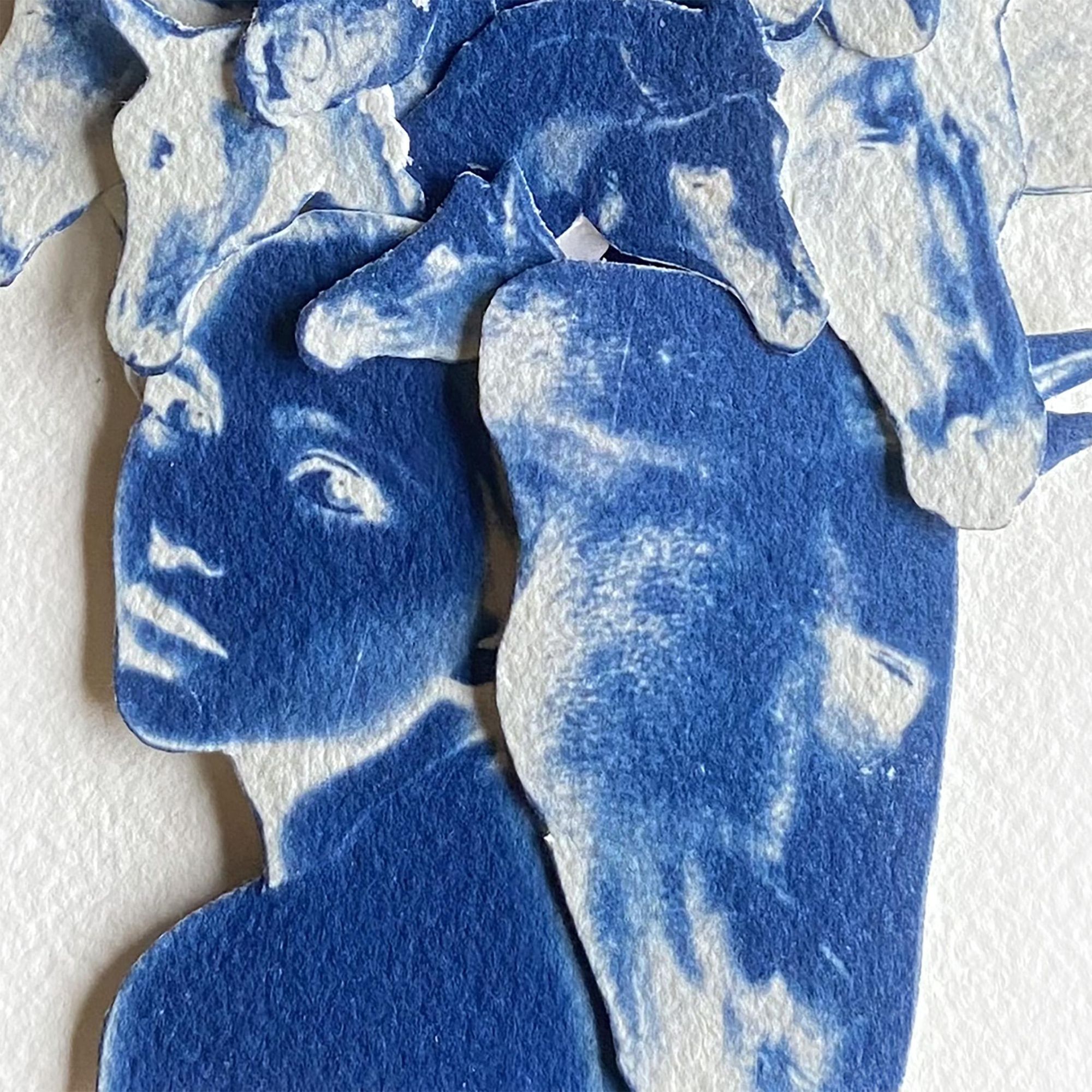 The prints are then processed by thoroughly washing in water to remove any unexposed solution. It can then be hung to dry, developing to full density Prussian blue after 24 hours. Once dried the individual component parts are cut out and mounted onto the print to create a multi-layered, 3-dimensional artwork.