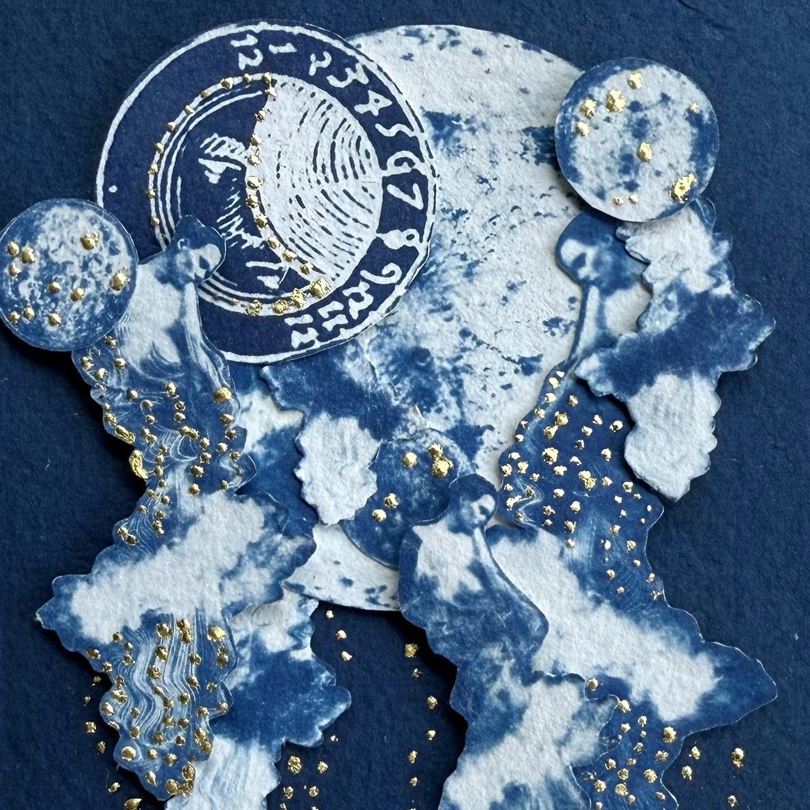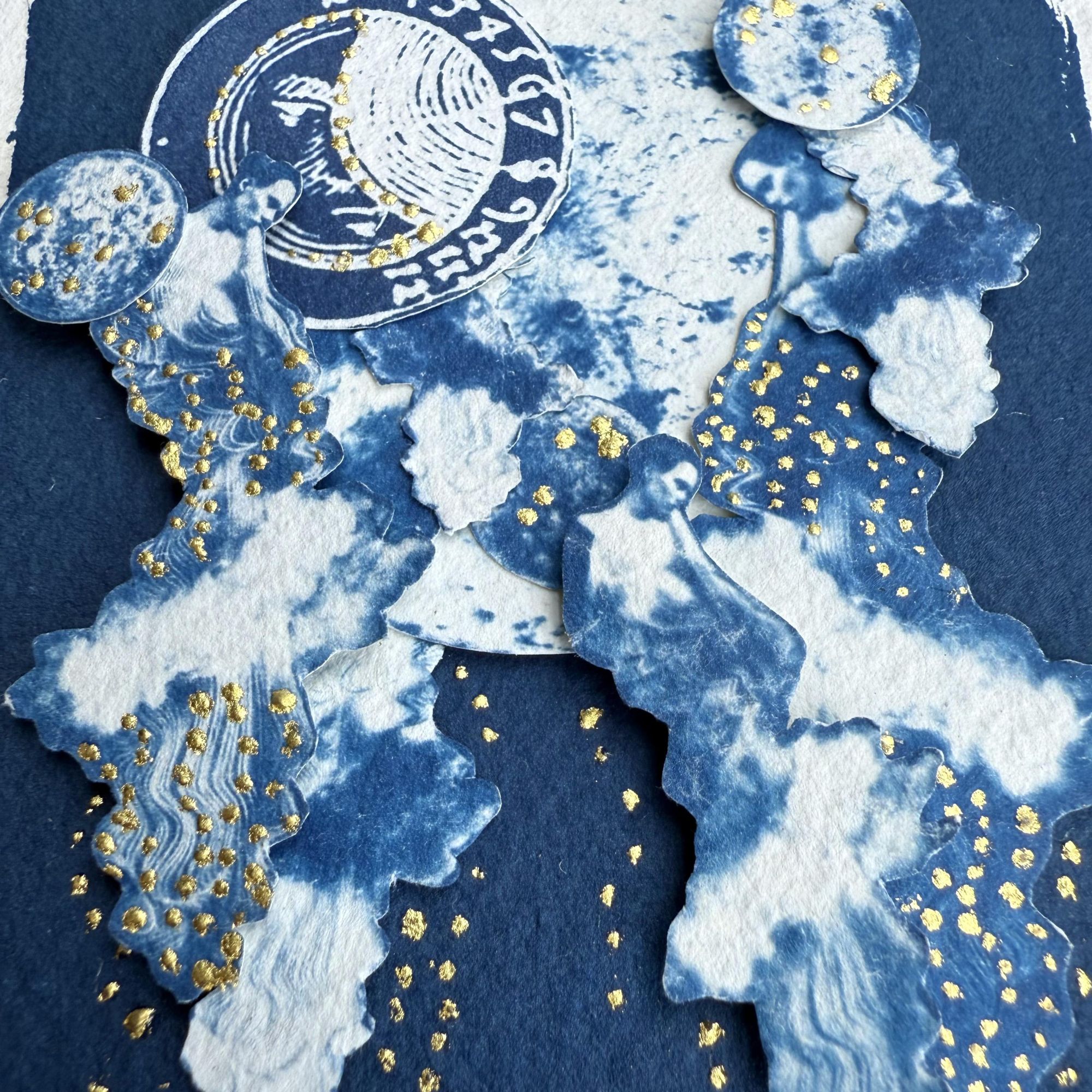 Cyanotype, handmade paper, 24-carat gold leaf, multi layered paper cut collage