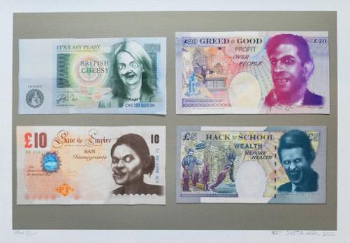 Tory banknotes depicting Truss, Sunak, Patel and Williamson.