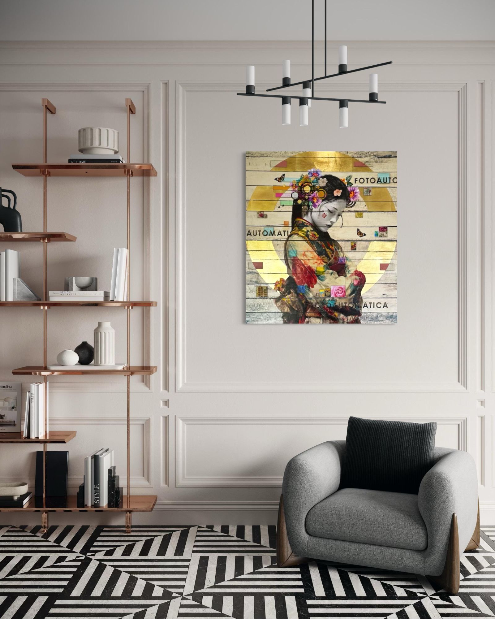 Giclée printed canvas combining digital and traditional design with hand applied techniques in the application of acrylics, Gold Leaf 'halo', 24 Carat Gold, Silver and Copper Leaf discs, lacquered tiles and authentic world postage stamps.