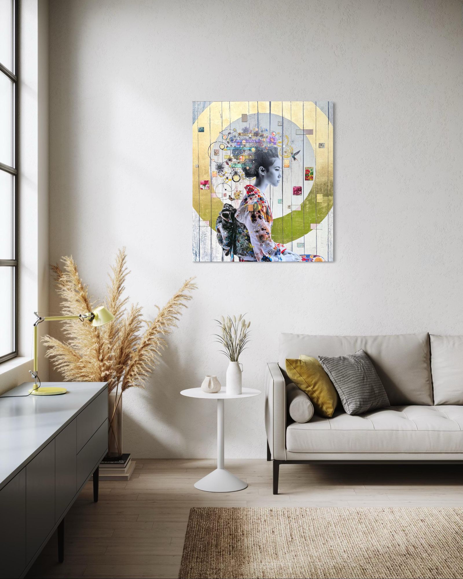 Giclee print on 330 gram cotton canvas hand finished with acrylics, Gold Leaf 'Halo', Japanese paper, Japanese stamps, 3D relief tiles, Gold, Copper and Variegated Silver discs and sparkling crystals.