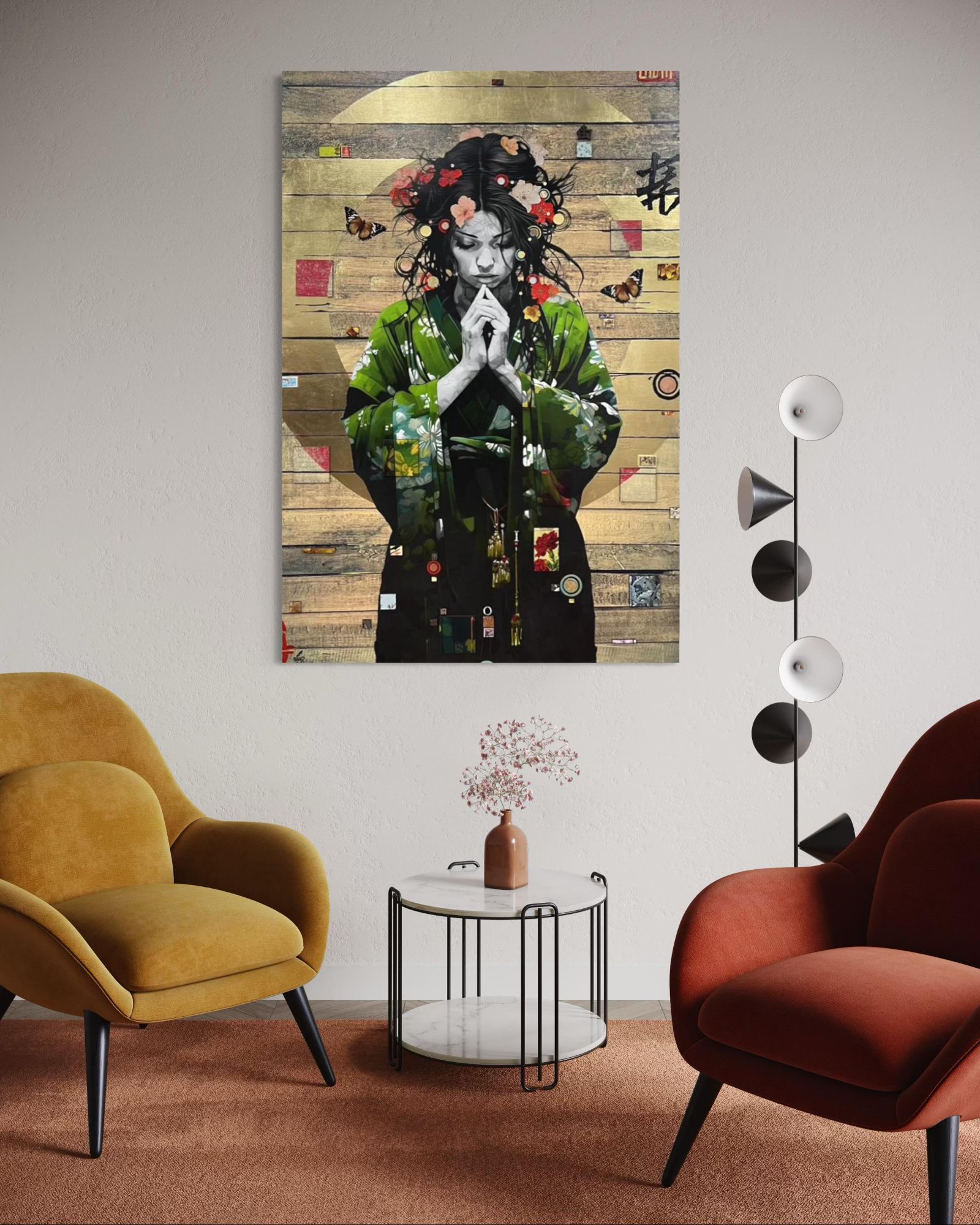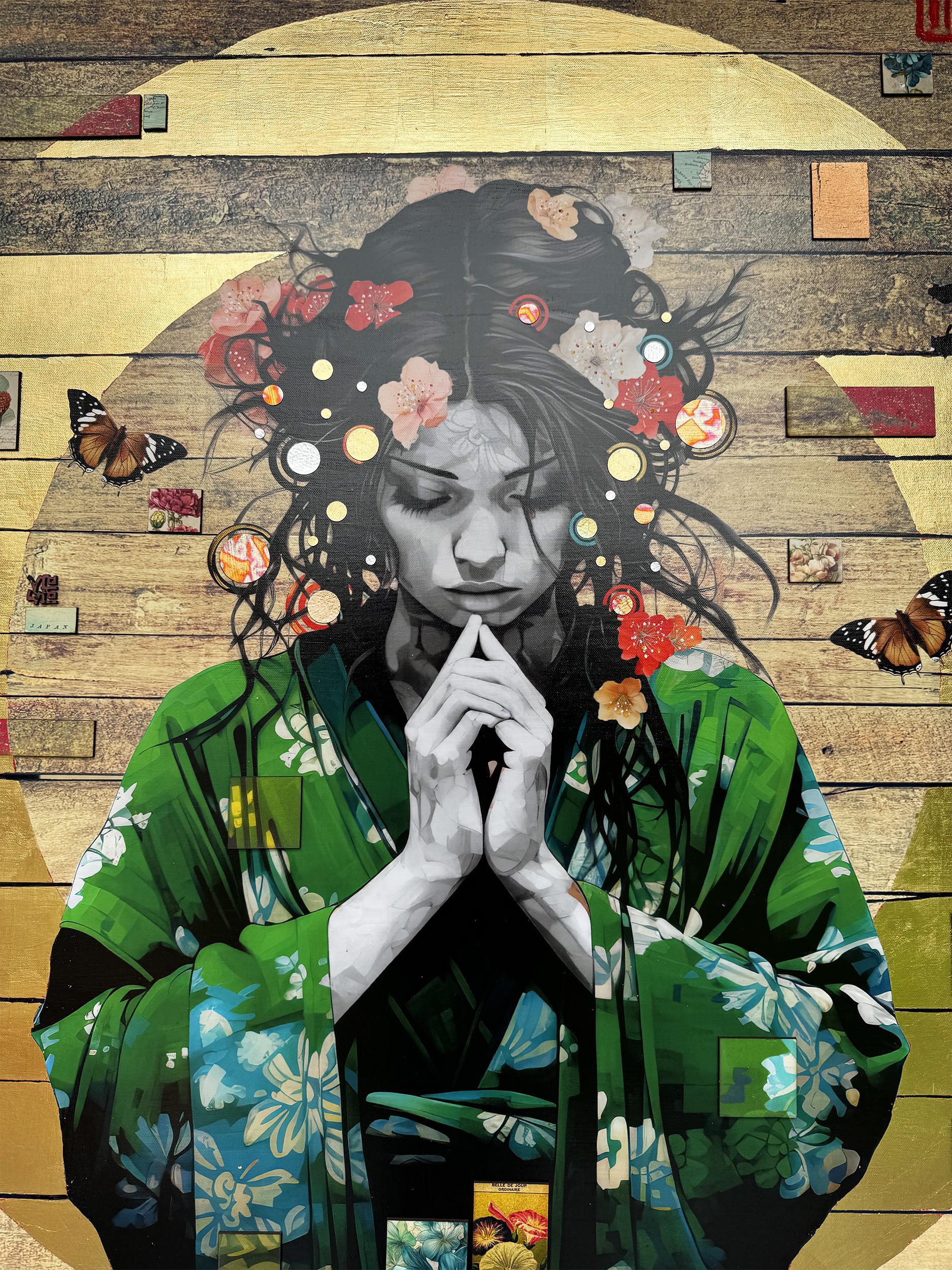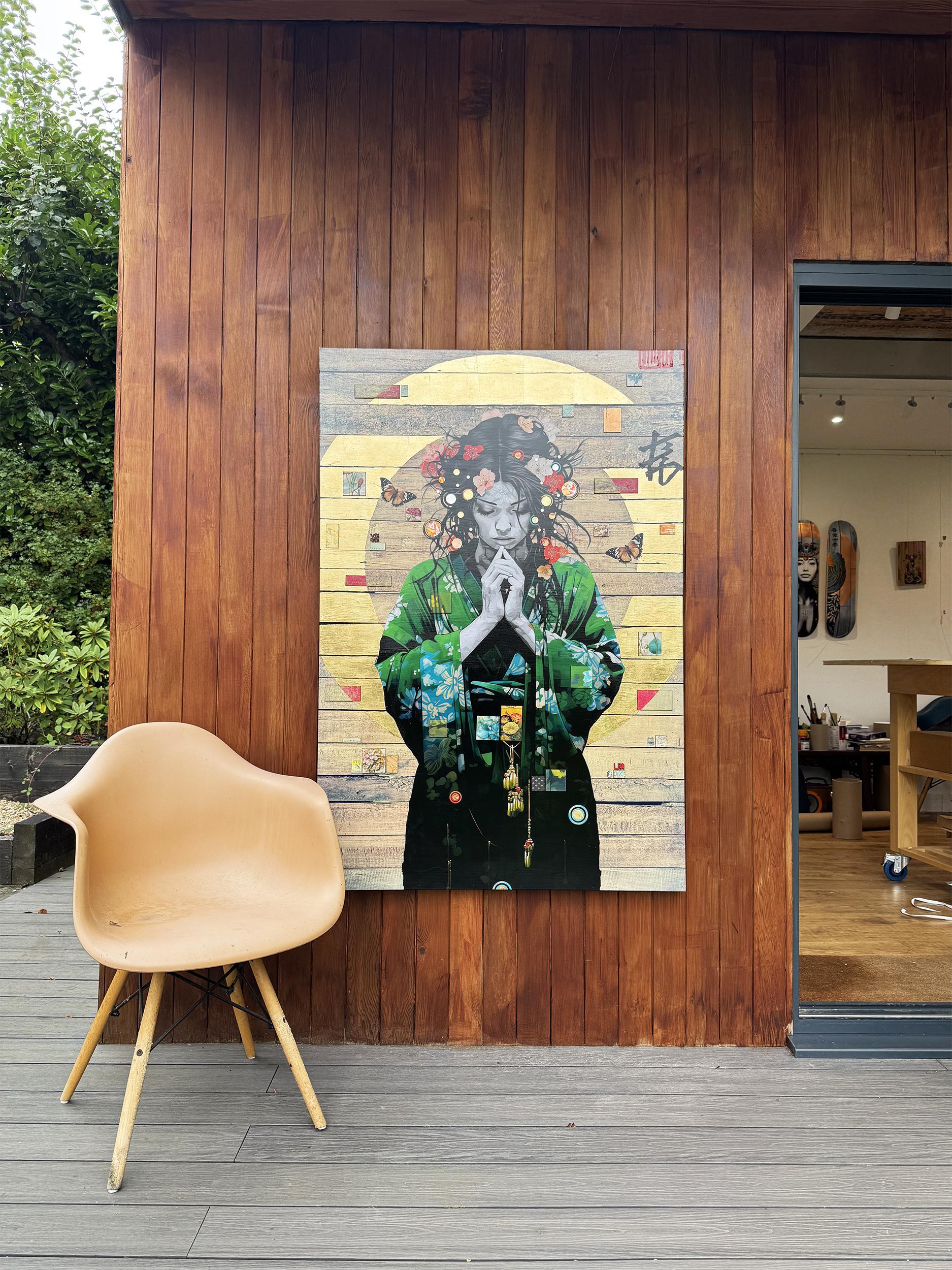 Giclée printed canvas combining digital and traditional design with hand applied techniques in the application of acrylics, Gold Leaf 'halo', 24 Carat Gold, Silver and Copper Leaf discs, lacquered tiles and authentic world postage stamps.