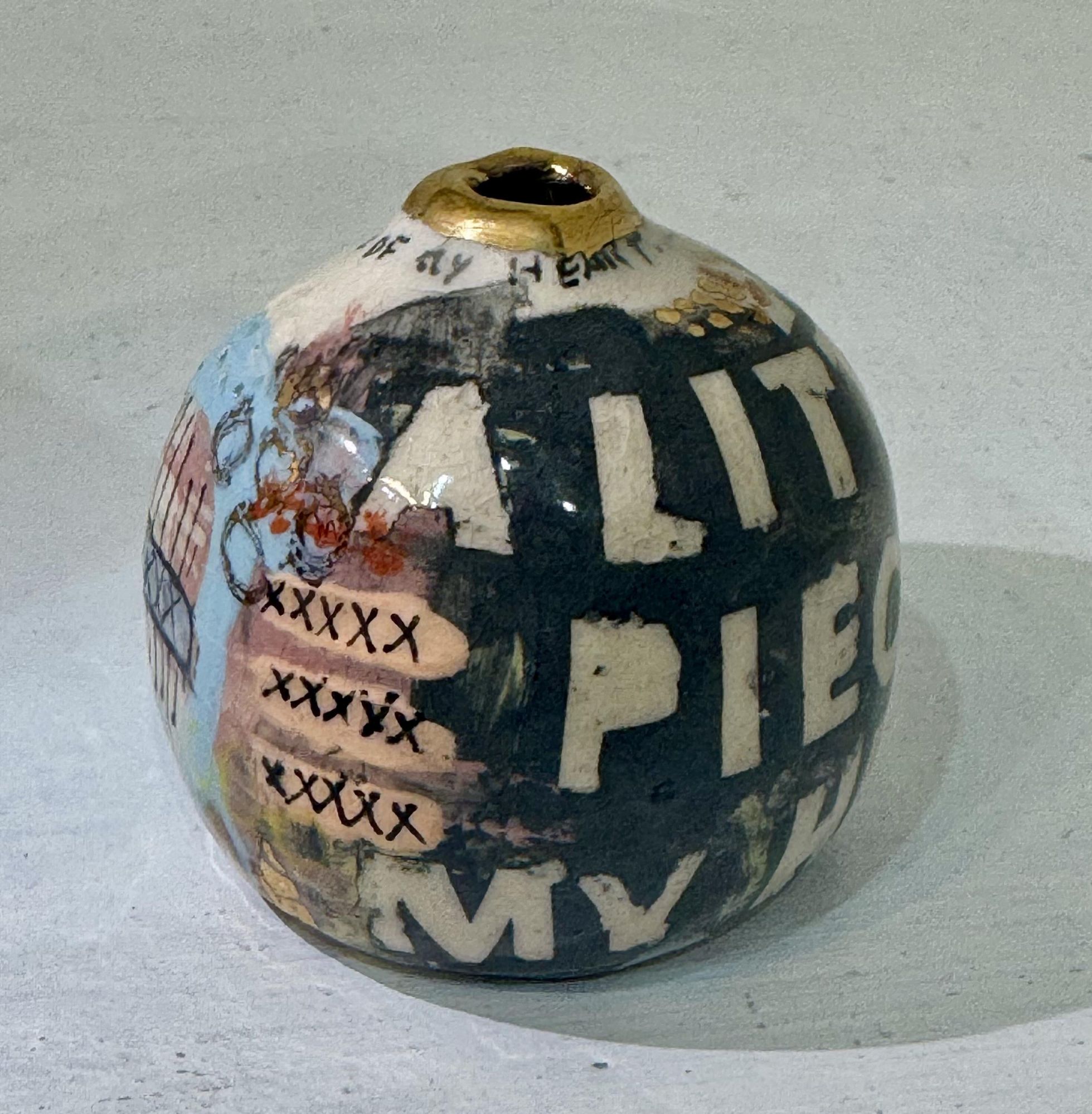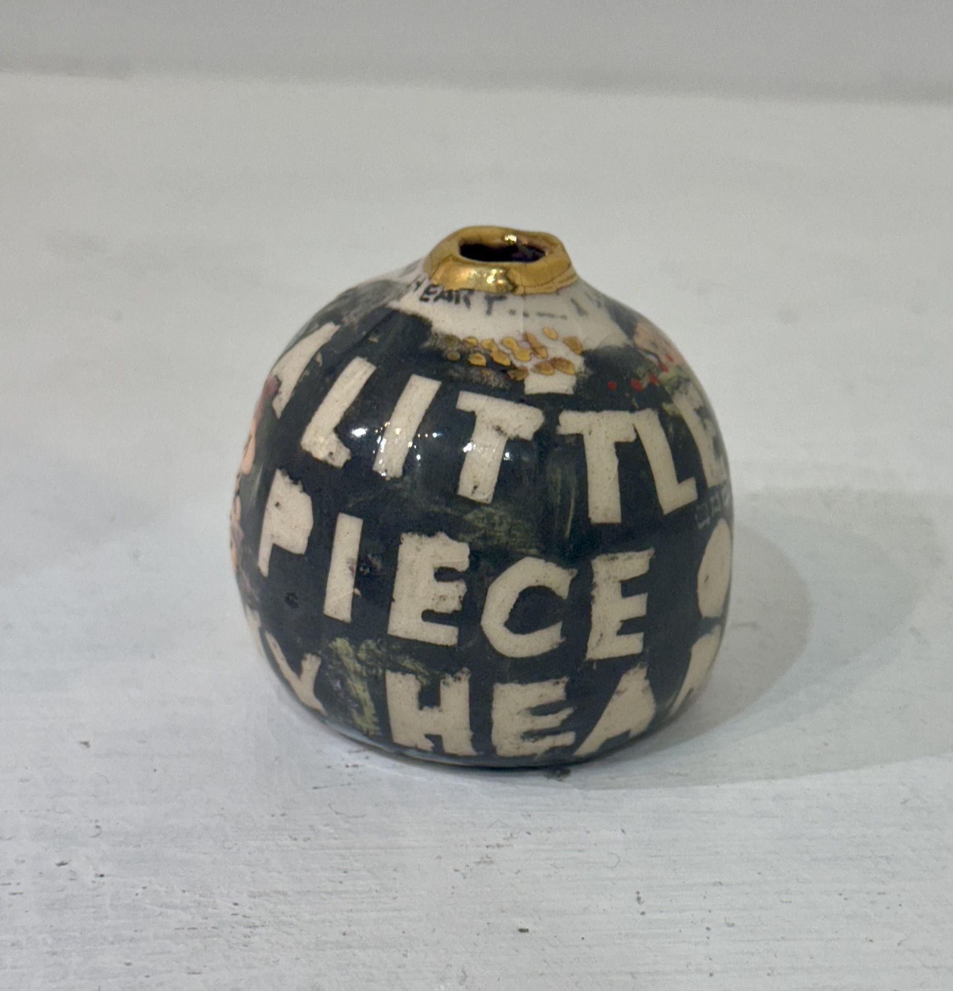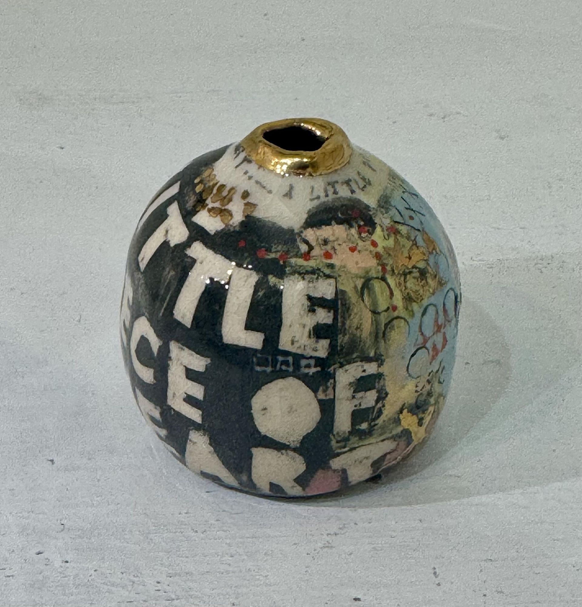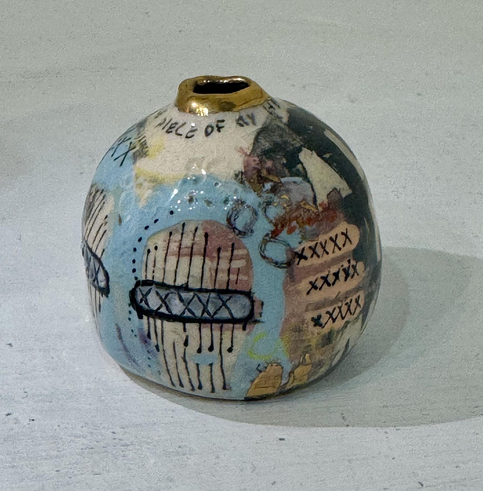 Hand built earthenware clay, coloured slips, underglazes, glazes & 24k gold luster.