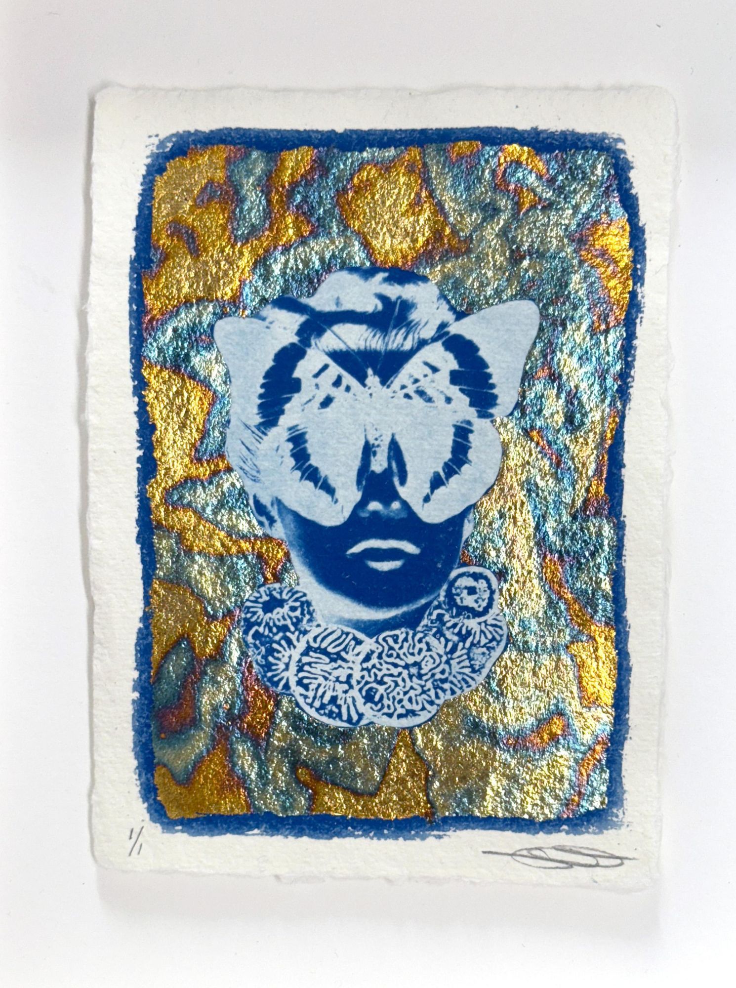 Cyanotype, handmade paper, chemically painted, heat treated zinc leaf.