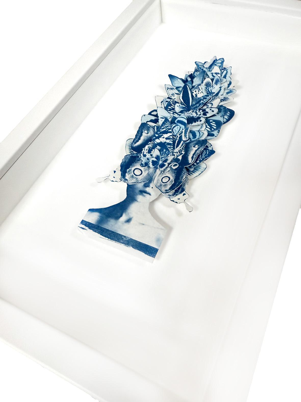 Lady Lepidopterist Study (Ode to Margaret Fountaine) was created by constructing a hand-cut collage using female photographic portraiture, a renaissance style wig made of layers of hydrangea flowers and photographs of preserved butterfly specimens from my private collection.