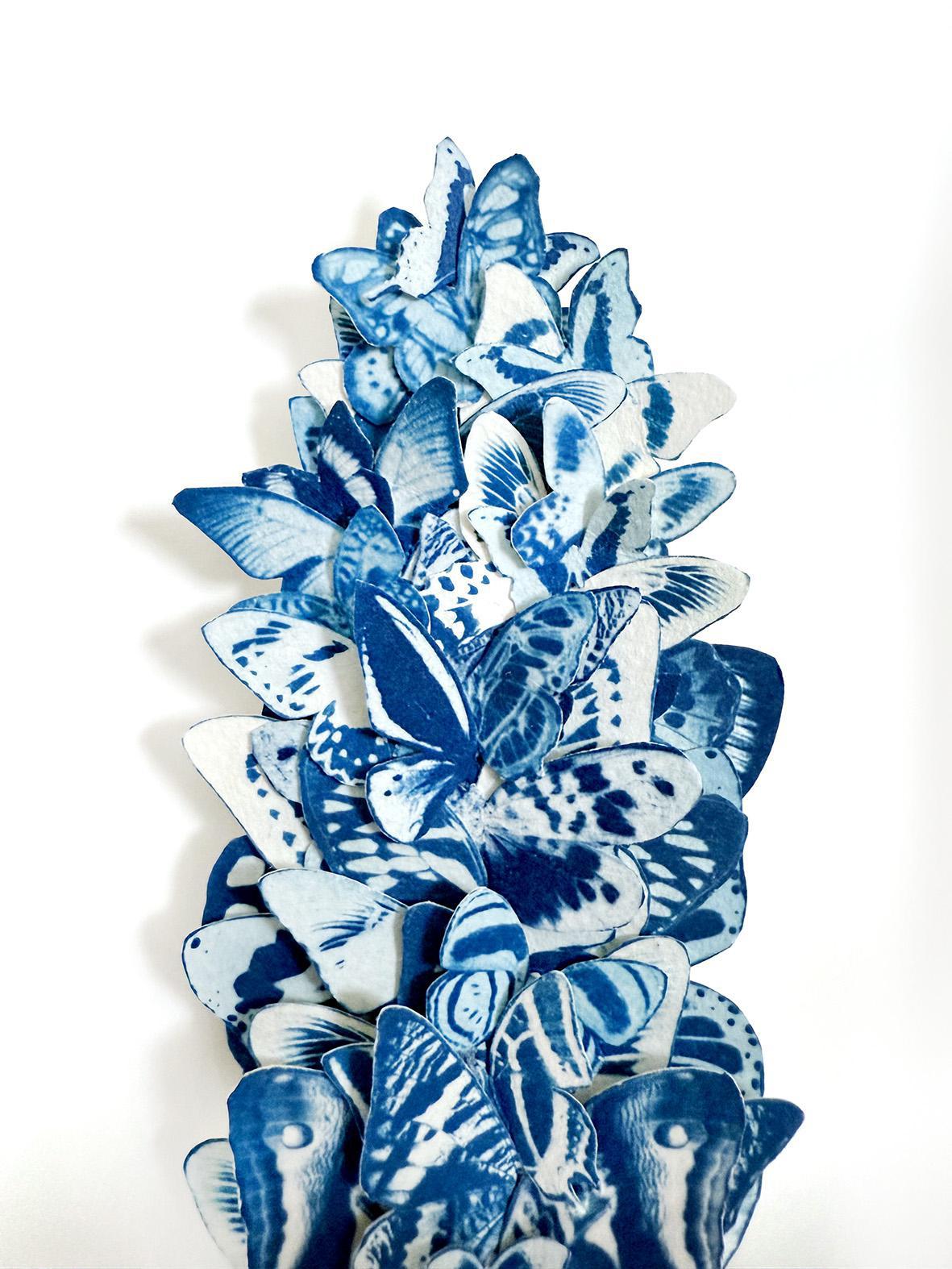 After coating the handmade paper with light-sensitive chemistry, they are left to dry in a dark room. The large scale negatives are then contact- printed onto the paper pieces by exposure to daylight (UV rays). The prints are then processed by thoroughly washing in water to remove any unexposed solution. They can then be hung to dry, developing to full density Prussian blue after 24 hours. Once dried the individual butterflies are cut out and mounted onto the print to create a multi-layered, 3-dimensional artwork.