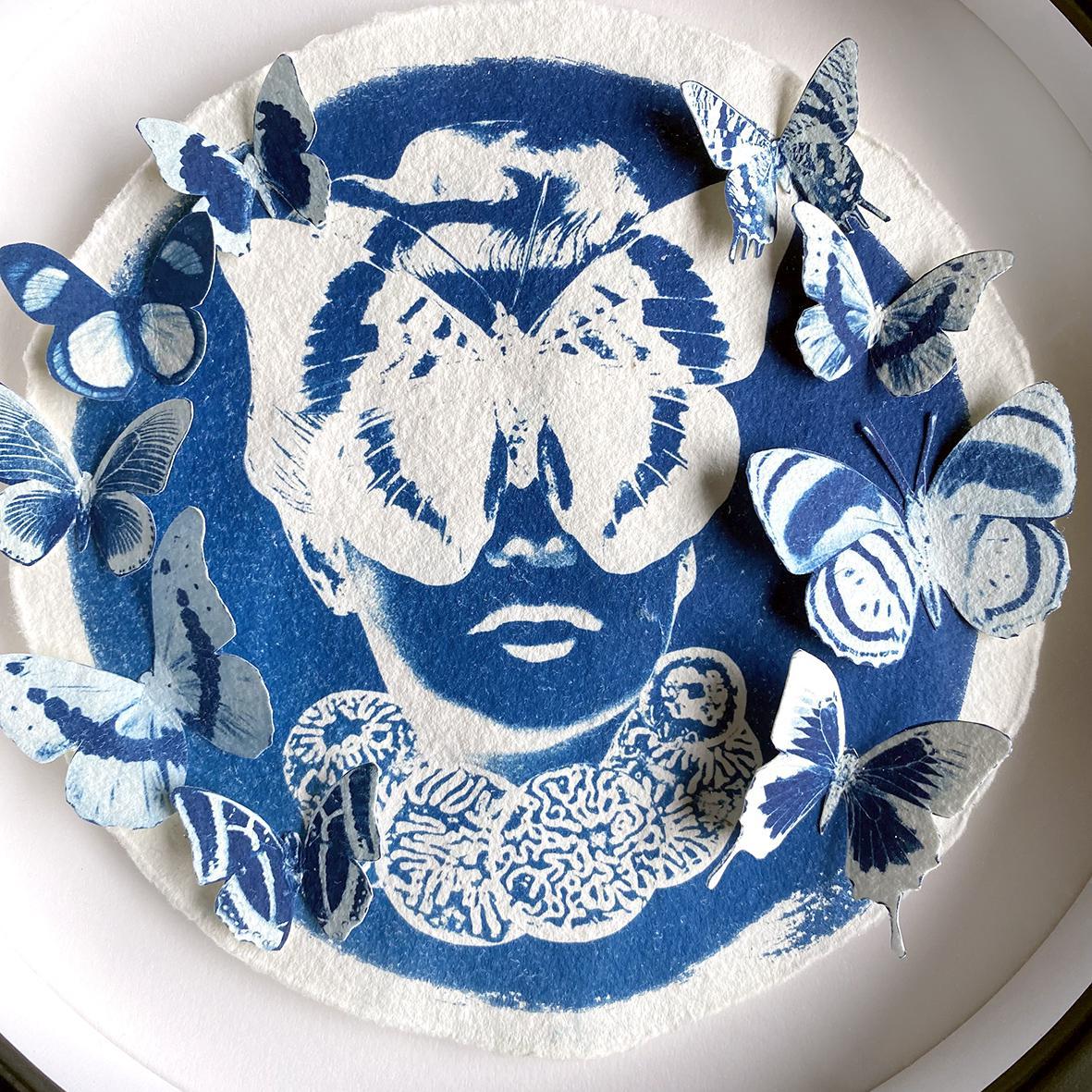 Cyanotype layers and handmade papercut butterflies