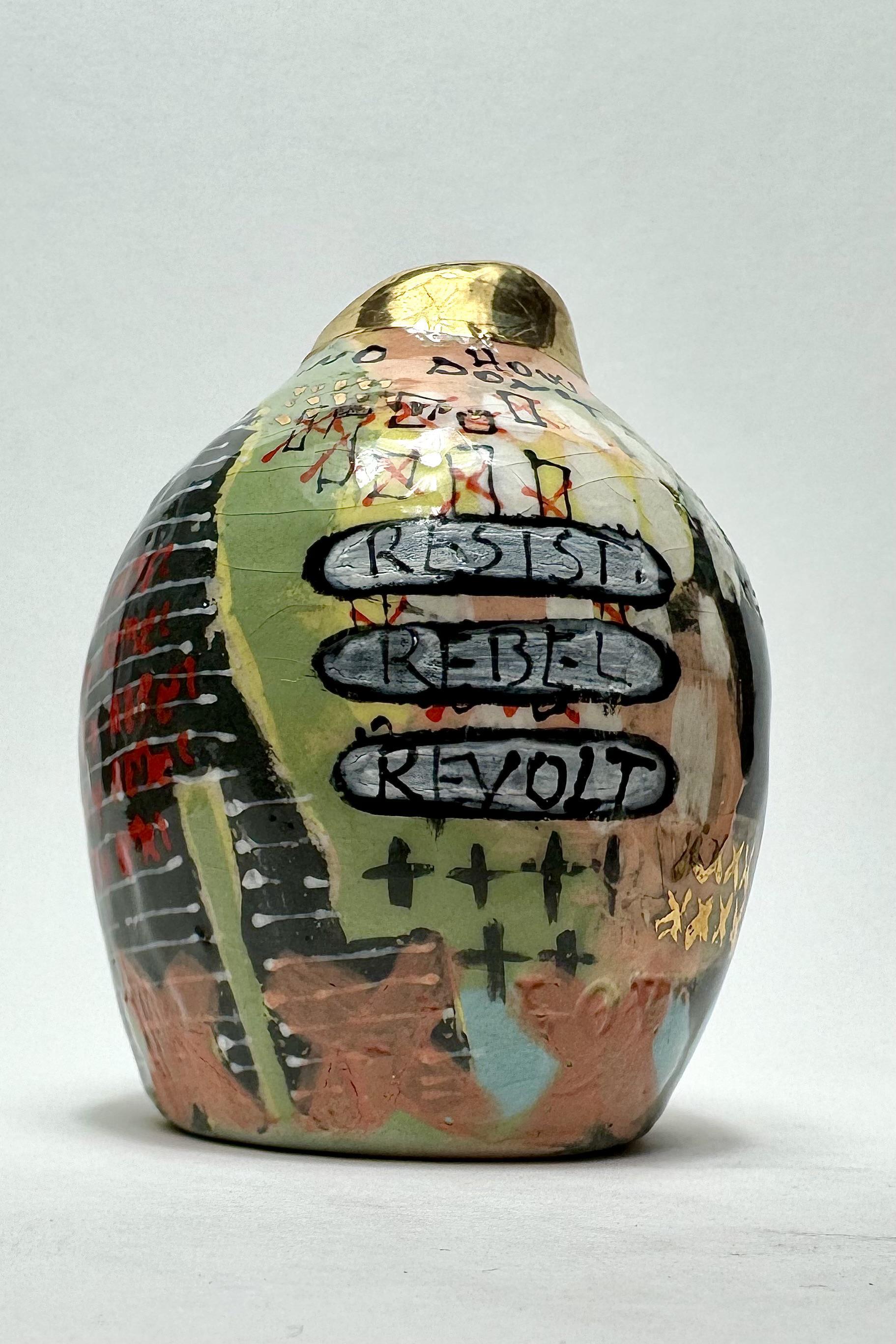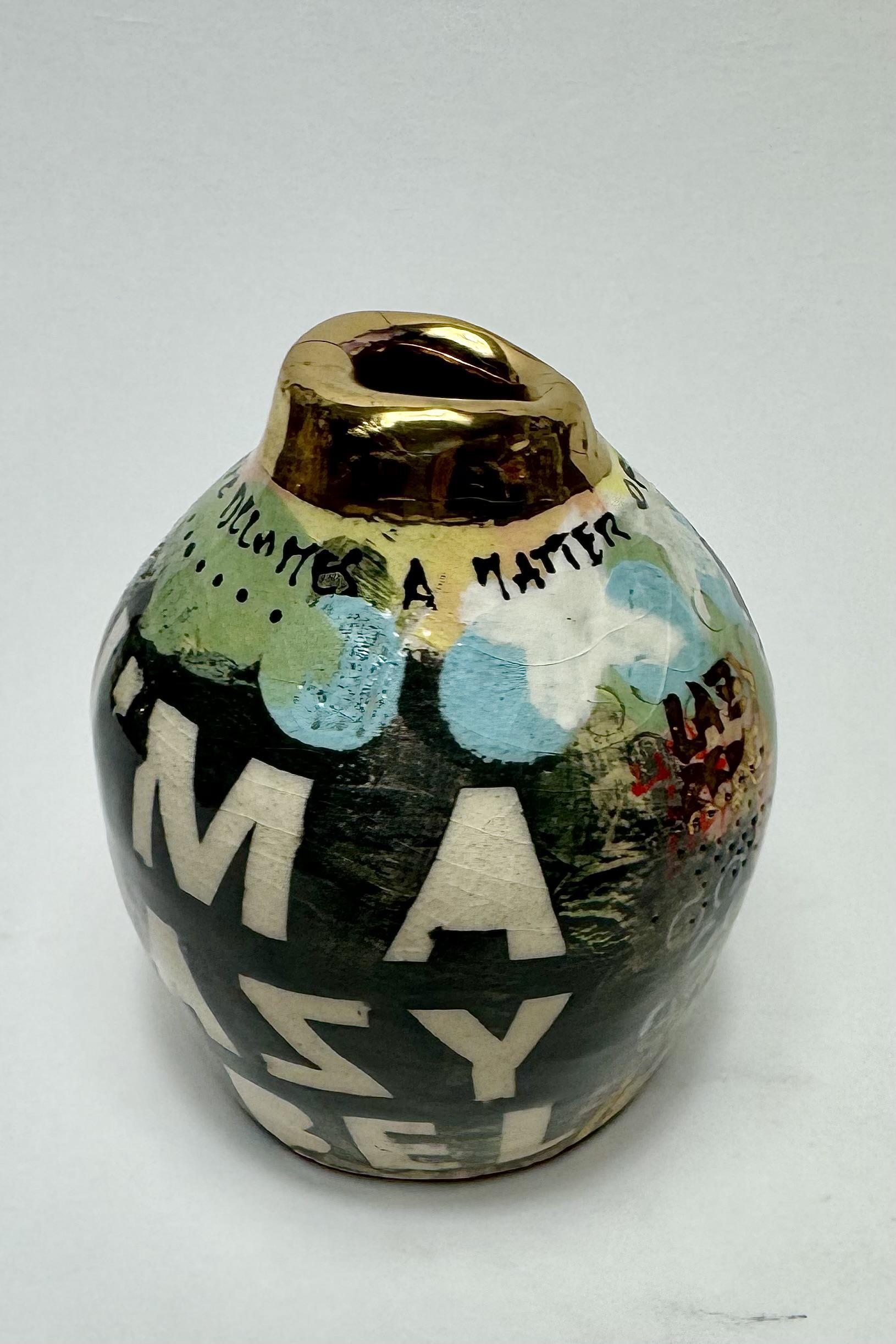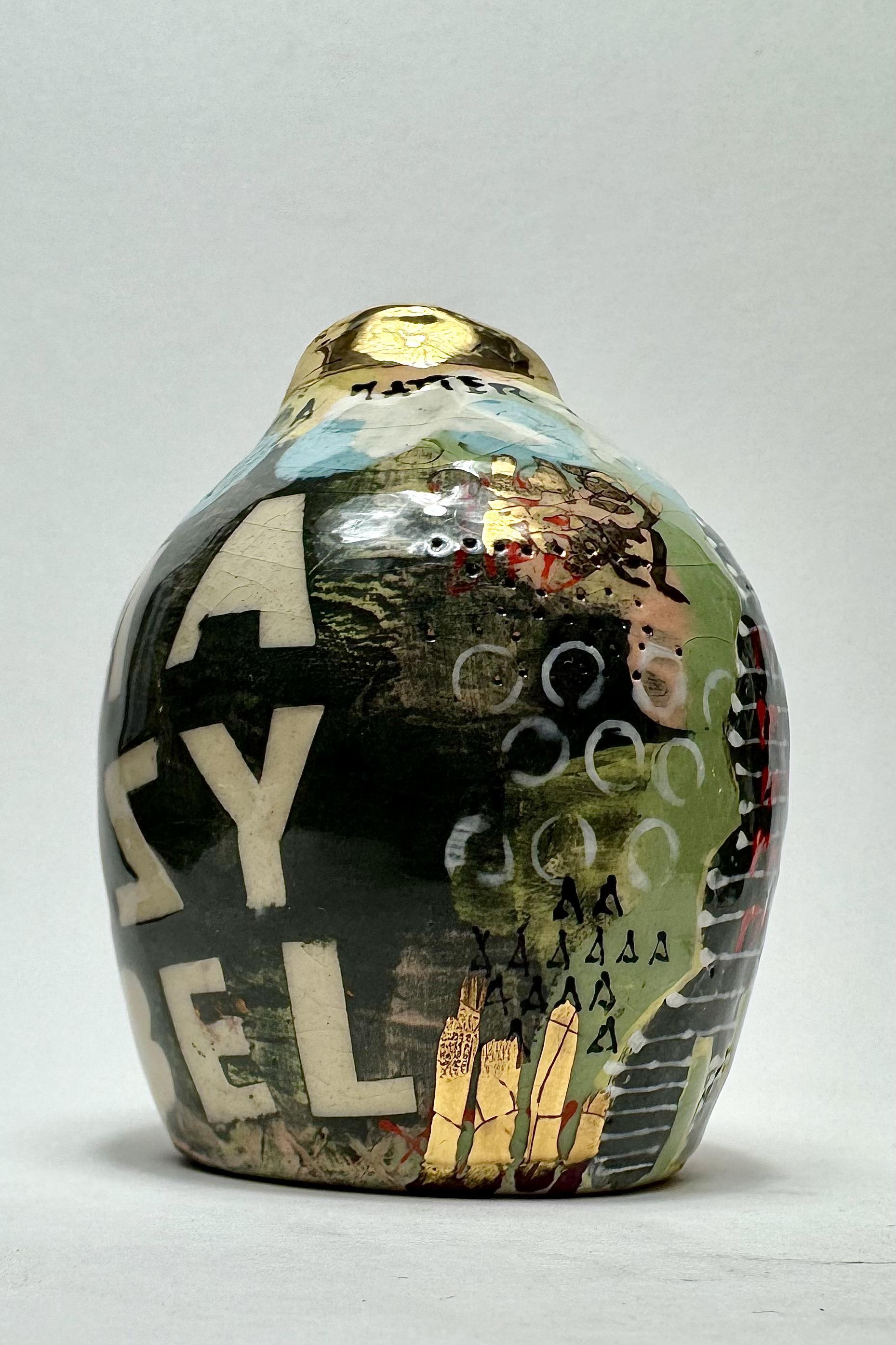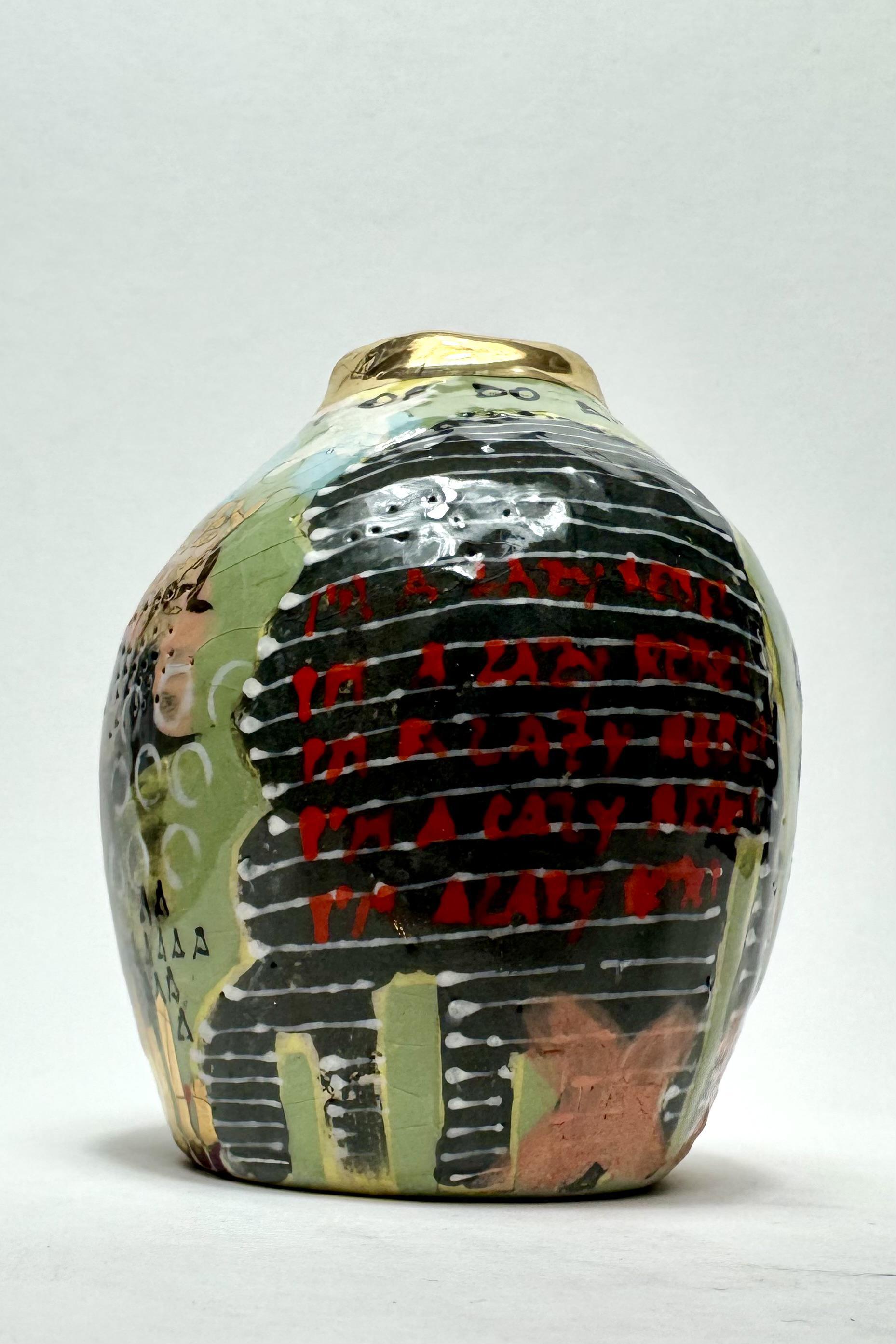 Hand built earthenware clay, coloured slips, underglazes, glazes & 24k gold luster.