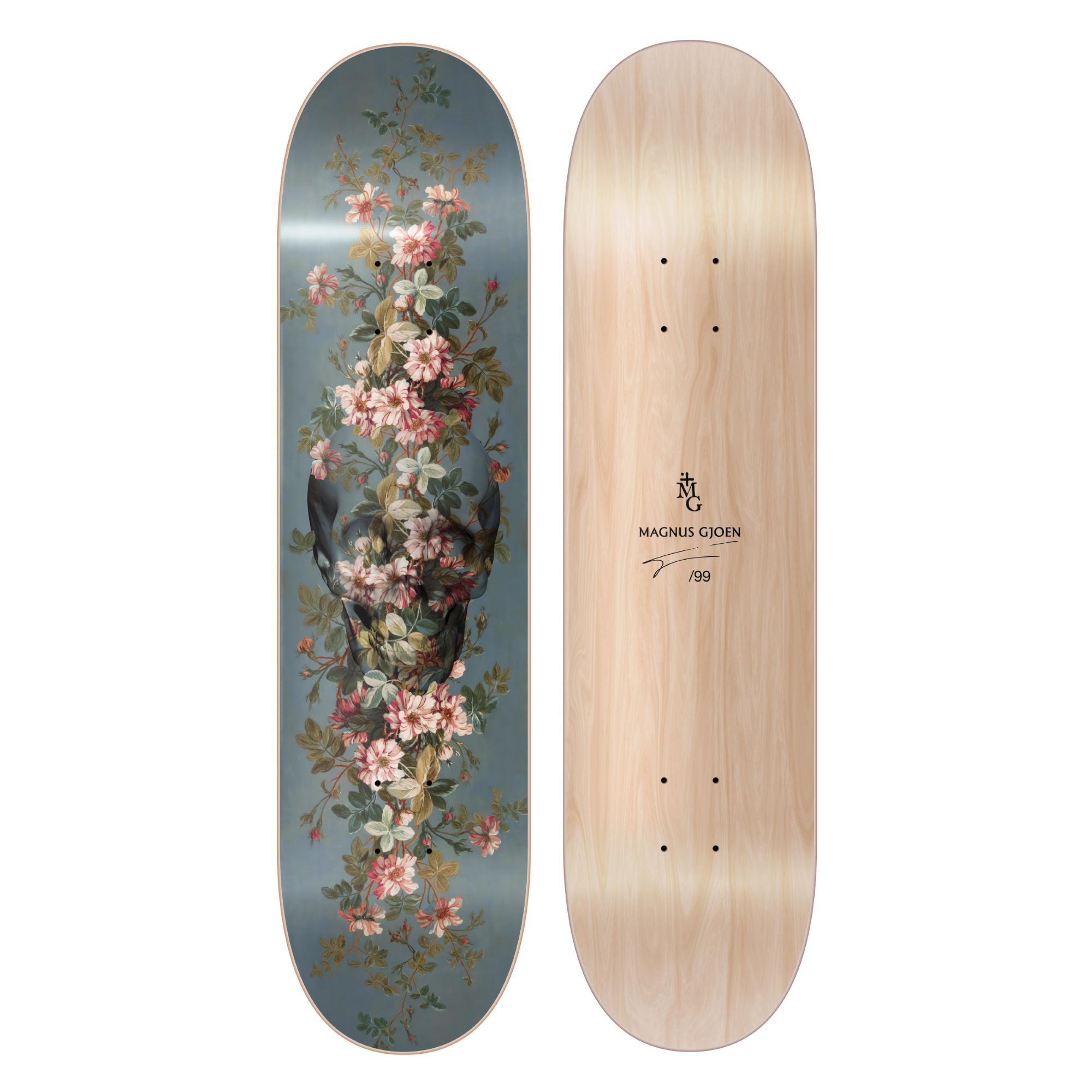 Magnus Gjoen's latest skate deck release, aptly named 'And Death Shall Have No Dominion,' is a captivating fusion of life and death rendered in exquisite detail. The deck showcases a stunning floral skull, where delicate blossoms intertwine with the stark anatomy, creating a mesmerizing contrast between beauty and mortality. The flowers, intricately designed, cascade both upwards and downwards on the skateboard, symbolizing the cyclical nature of life and death. Gjoen's masterful blend of the macabre and the botanical not only transforms the skate deck into a unique canvas but also invites contemplation on the interconnectedness of existence and the enduring power of nature. 'Death Shall Have No Dominion' is not just a skateboard; it is a visual narrative that challenges perceptions and celebrates the inherent harmony between life's fragility and its everlasting resilience.